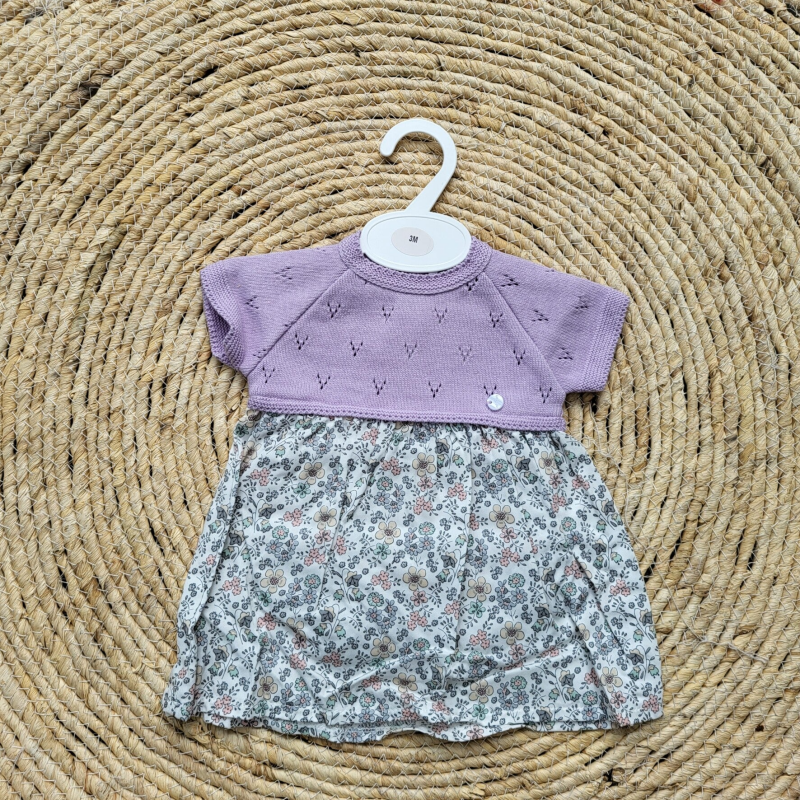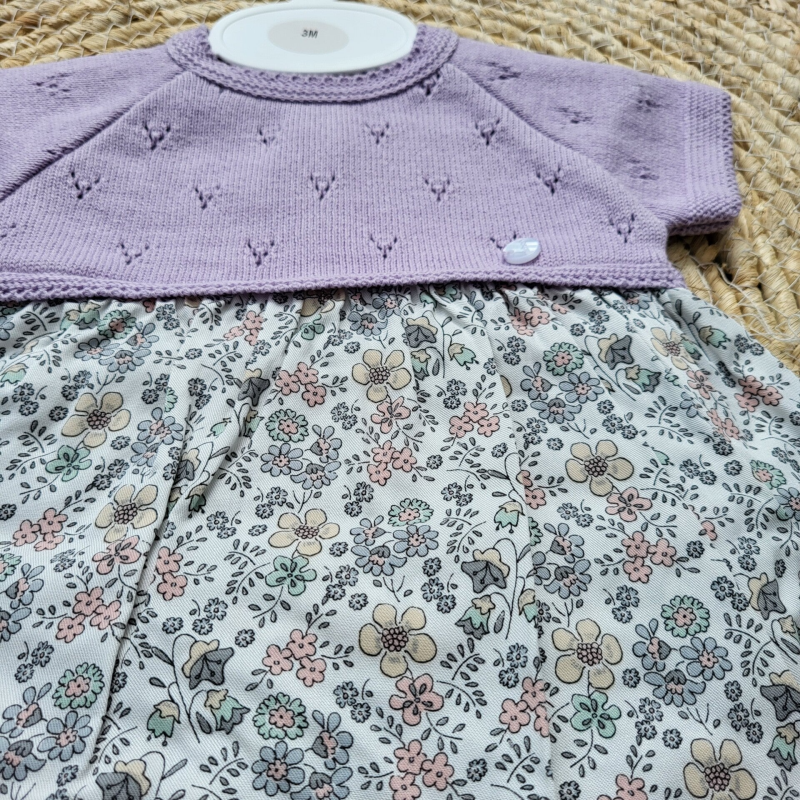 Prachtige jurk met lavendelbloemen en een luierbroekje. De jurk is gemaakt van 100% katoen. De bovenkant is gebreid in fijn katoenweefsel, de onderkant is gemaakt van zacht katoen. Het luierbroekje heeft een zachte elastische band.